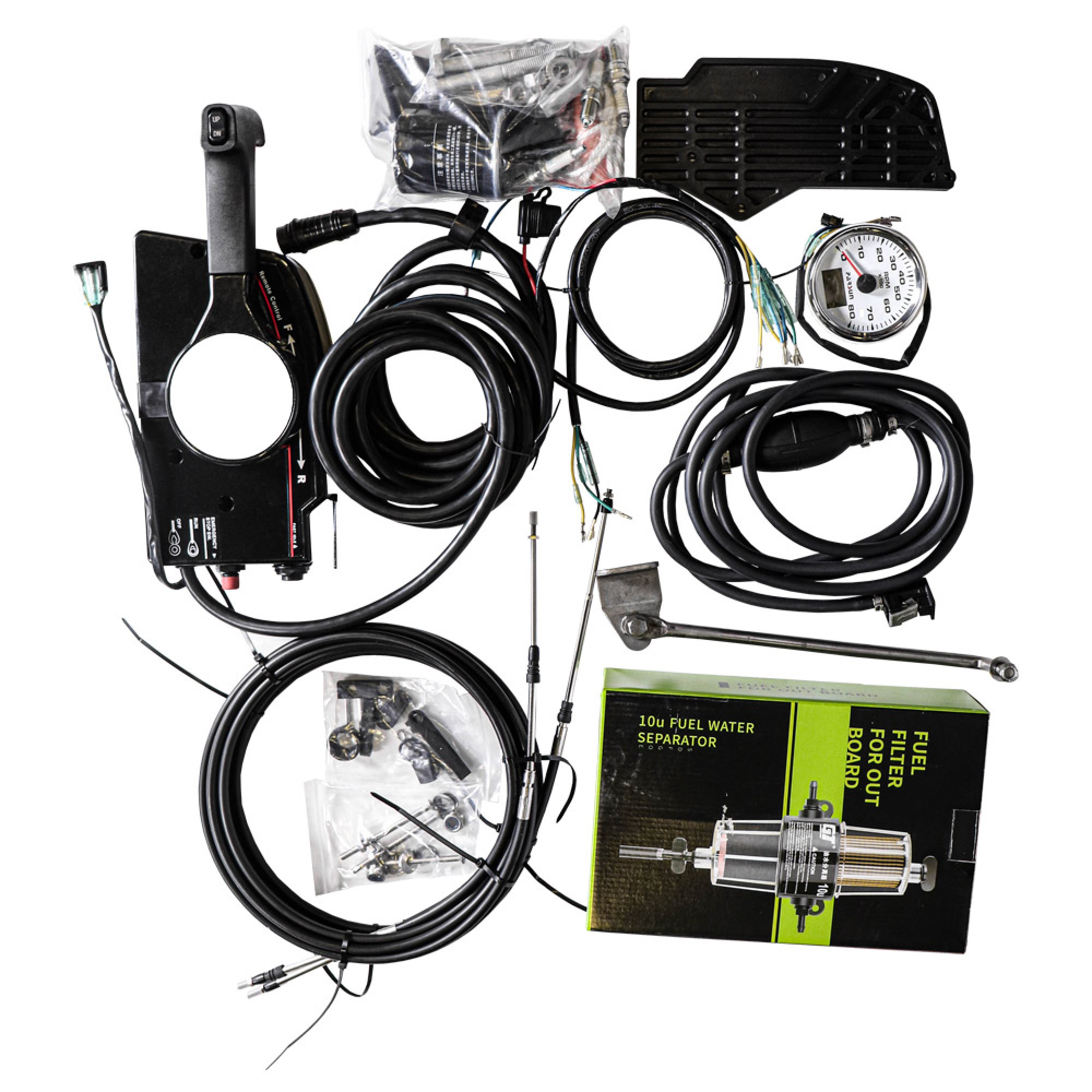 В богатую заводскую комплектацию входят: блок дистанционного управления, тросы газ-реверс, рулевая тяга с кронштейном, выносной топливный бак на 24 литра, шланг, внешний топливный фильтр-сепаратор, тахометр, набор из 3 запасных свечей зажигания DPR7EA-9, масляный фильтр, шнур аварийного старта, чека безопасности и необходимые для обслуживания инструменты.